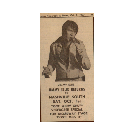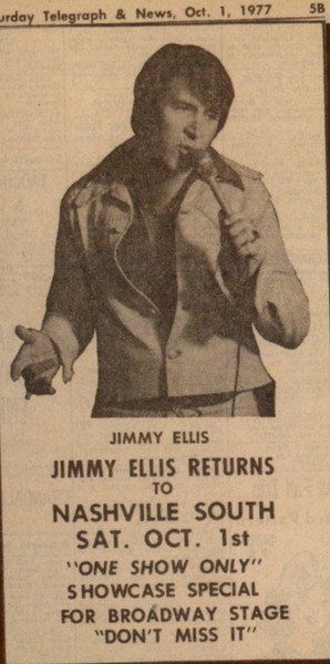 1977* Nashville Square Club,2nd. April ---- Jacopa Club, Phenix, AlabamaApril* ---- Nashville South Club, Macon, Georgia(Several dates)May * ----- Jaycees State Convention, Jekyll Island, GeorgiaAugust* ----- Jessup, Georgia15th. September ----- Nashville South Club, Macon, Georgia16th. September ----- Nashville South Club, Macon, Georgia23rd. September ___ Nashville South Club, Macon, Georgia24th. September ___ Nashville South Club, Macon, Georgia1st. October ----- Nashville South Club, Macon, Georgia26th. October ----- Agricultural Fair, Brunswick, Georgia(2 shows)27th. October ----- National Guard Armory(8:00pm show)December* ---- Nashville South Club, Macon, Georgia(Several dates)Also played several venues in the Georgia area throughout 1977