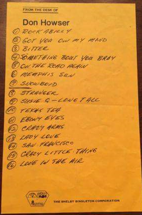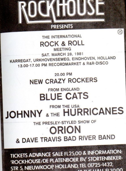 1st. January ----- Holiday Inn, Navarre Beach, Florida(5:00pm show for hotel guests only)2nd. January ----- St. Lucie Civic Centre, Fort Pierce, Florida(8:00pm show)3rd. January ----- Civic Center, Melbourne, Florida(8:00pm show)5th. January ----- Bootleg County Lodge, Orange Park, Florida(Shows at 8:00pm and 11:00pm)6th. January ----- Georgia (No other info available)7th. January ----- Georgia (No other info available)8th. January ----- Georgia (No other info available)9th. January ----- Georgia (No other info available)10th. January ----- Georgia (No other info available)11th. January ----- Georgia (No other info available)12th. January ----- High School Auditorium, Flomaton, Alabama(Shows at 1:30pm -For students and 7:30pm - Regularshow)13th. January ----- Alabama (No other info available)14th. January ----- Alabama (No other info available)15th. January ----- Alabama (No other info available)16th. January ----- Lincoln High School Auditorium, Lincoln, Alabama(8:00pm show)17th. January ----- Athens Middle School, Athens, Alabama(8:00pm show)18th. January ----- Waynesboro, Tennessee (Tentative date)19th. January ----- Louisiana (Tentative date)20th. January ----- Louisiana (Tentative date)21st. January ----- Louisiana (Tentative date)22nd. January ----- Arkansas (No other info available)23rd. January ----- Arkansas (No other info available)24th. January ----- Arkansas (No other info available)25th. January ----- Savage Theatre, Booneville, Arkansas(Shows at 3:00pm and 7:00pm)26th. January ----- Middle School Auditorium, Henderson, Texas(7:30pm show)27th. January ----- Texas (No other info available)28th. January ----- Southern Comfort Club, Fort Worth. Texas(Shows at 8:00pm and 10:00pm)29th. January ----- Southern Comfort Club, Fort Worth. Texas30th. January ----- Texas (No other info available)31st. January ----- Texas (No other info available)1st. February ----- Texas (No other info available)2nd. February ----- Illinois and Indiana (No other info available)3rd. February ----- Illinois and Indiana (No other info available)4th. February ----- Illinois and Indiana (No other info available)5th. February ----- Illinois and Indiana (No other info available)6th. February ----- Frankie's Tumbleweed Club, New Castle, Indiana7th. February ----- Lisle Junior High School, Lisle, Illinois(Shows at 5:00pm and 9:00pm)8th. February ----- Packard Music Hall, Warren, Ohio(Shows at 4:00pm and 7:30pm)9th. February ----- Kentucky and West Virginia or Portsmouth, Ohio(No other info available)10th. February ----- Joey's El Cid Club, Beckley, West Virginia(Shows at 10:00pm and 12:00pm)11th. February ----- Kentucky and West Virginia(No other info available)12th. February ----- Kentucky and West Virginia(No other info available)13th. February ----- Mike's Place, Richmond, Virginia(Shows at 9:00pm and 11:00pm)14th. February ----- Eleanor Roosevelt Auditorium, Greenbelt, Maryland(8:00pm show)15th. February ----- Pennsylvania (No other info available)16th. February ----- Pennsylvania (No other info available)17th. February ----- Pennsylvania (No other info available)18th. February ----- Pennsylvania (No other info available)19th. February ----- Pennsylvania (No other info available)20th. February ----- Pennsylvania (No other info available)21st. February ----- Pennsylvania (No other info available)22nd. February ----- Pennsylvania (No other info available)23rd. February ----- Virginia, North Carolina & South Carolina (No other infoavailable)24th. February ----- Virginia, North Carolina & South Carolina (No other infoavailable)25th. February ----- Virginia, North Carolina & South Carolina (No other infoavailable)26th. February ----- Virginia, North Carolina & South Carolina (No other infoavailable)27th. February ----- Virginia, North Carolina & South Carolina (No other infoavailable)28th. February ----- Cock County HS Auditorium, Newport, Tennessee(8:00pm show)4th. March ----- Montreal, Canada (No further details available)5th. March ----- Montreal, Canada (No further details available)6th. March ----- Montreal, Canada (No further details available)7th. March ----- Montreal, Canada (No further details available)8th. March ----- Montreal, Canada (No further details available)13th. March ----- Tigrett Jr. High School, Jackson, Tennessee(8:00pm show)14th. March ----- Nashville, Tennessee (No further details available)20th. March ----- Tampa Theatre, St. Petersburg, Florida(8:00pm show)21st. March ----- West Georgia Music Park, Carrolton, Georgia22nd. March ----- Tour of Holland and Belgium(With a concert at Le Brazil, Hognoul, Belgium on 23rd.March. A television appearance in Holland on 27th.March and a live performance at a Rock'n'Roll showat Rockhouse in Eindhoven, Holland on 28th. March.Tour ending on 30th. March).March ----- Asheville, Ohio4th. April ----- Green Country Danceland, Poteau, Oklahoma(Shows at 10:00pm and 12:00pm)5th. April ----- Hopkins County Civic Center, Sulphur Springs, Texas(3:00pm show)16th. April ----- Marlowe's Country Palace, Pikeville, Kentucky17th. April ----- Marlowe's Country Palace, Pikeville, Kentucky18th. April ----- Marlowe's Country Palace, Pikeville, Kentucky24th. April ----- Eagles Club, Kenosha, Wisconsin(Shows at 7:00pm and 9:30pm)1st. May ----- The Honeywell Center, Wabash, Indiana(8:00pm show)2nd. May ----- Teay's Valley HS Auditorium, Ashville, Ohio(8:00pm show)3rd. May ----- Stardust Records, Ft. Findlay Mall, Findlay, Ohio3rd. May ----- The Hollow Inn, McCutchenville, Ohio(Shows at 2:00pm and 7:00pm)7th. May ----- Hyatt Regency Hotel, Knoxville, Tennessee(Black tie affair)8th. May ----- Tracks, Ward's Corner, Norfolk, Virginia8th. May ----- Michael's, Virginia Beach, Virginia(Shows at 7:00pm and 10:00pm)9th. May ----- Harmony Hut, Spotsylvania Mall. Fredricksburg, Virginia9th. May ----- North Forty Club, Newburg, Maryland(Shows at 8:00pm and 11:00pm)10th. May ----- The Rodeway Inn, Asheville, North Carolina(7:00pm show)11th. May ----- Savannah, Georgia12th. May ----- Rec