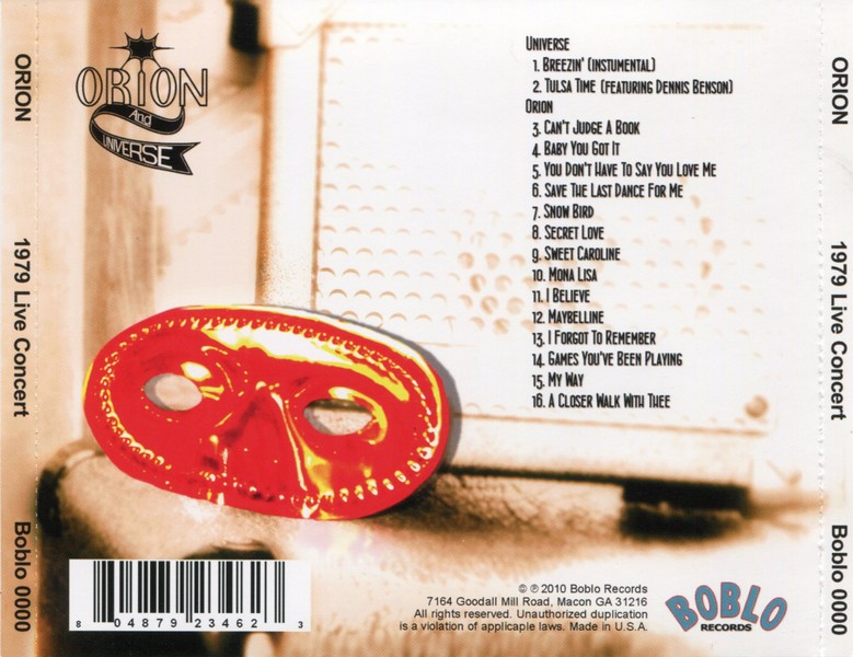 NOTES: First two tracks are by backing band Universe, no Orion involvement. Despite the title, many of the Orion tracks have been issued before on the Muscle Shoulders release ORION & UNIVERSE and all tracks have audience applause overdubbed to give the impression of being live recordings.