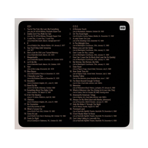 Fantastic live concert - recorded from the audience. Sound is incredibly good coming from an audience tape. Hear super rare performances of "WInter Wonderland" and "White Christmas" among others. Comes in a plastic CD tray as seen in the photo with color front and back. Disc is cd-r.