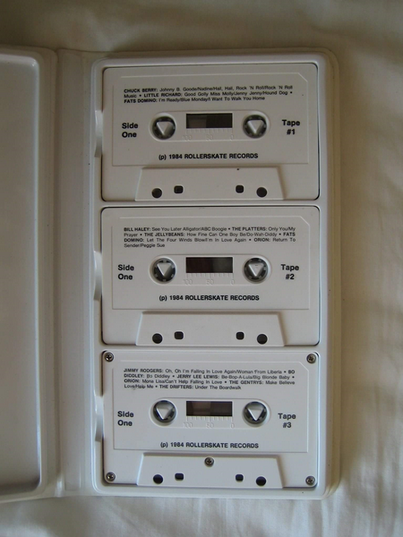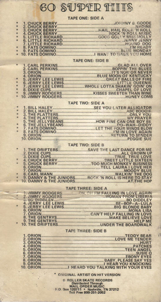 Tape One: Johnny B. Goode (Chuck Berry); Nadine (Chuck Berry); Hail Hail Rock N Roll (Chuck Berry); Rock N Roll Music (Chuck Berry); Good Golly Miss Molly (Little Richard); Hound Dog (Little Richard); I'm Ready (Fats Domino); Blue Monday (Fats Domino); I Want To Walk You Home (Fats Domino); Glad All Over (Carl Perkins); Boppin' The Blues (Carl Perkins); It's Now Or Never (Orion); Blue Moon Of Kentucky (Orion); Great Balls Of Fire (Jerry Lee Lewis); Little Queenie (Jerry Lee Lewis); Whole Lotta Shakin' Goin' On (Jerry Lee Lewis); Chapel Of Love (The Dixie Cups); Kisses Sweeter Than Wine (Jimmie Rodgers); Honeycomb (Jimmie Rodgers).