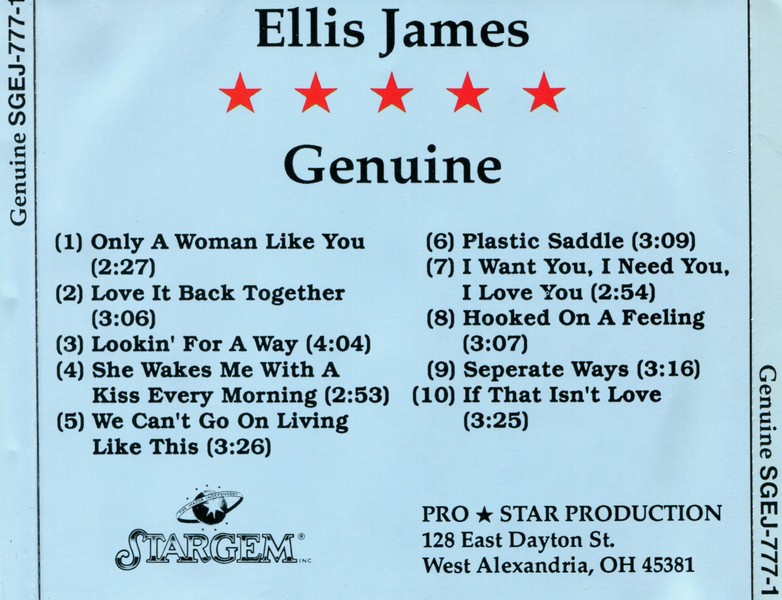 SPECIAL NOTE: This release credited to Ellis James. Several of Jimmy's releases on Stargem were issued with cover variations, the same releases were issued with credit to Ellis James and again with credit to Orion. Even more confusing is the fact that an album would be credited to Ellis James while the single issued to promote the album would be credited to Orion. There were two 45rpm vinyl single releases taken from this album - I WANT YOU, I NEED YOU, I LOVE YOU/PLASTIC SADDLE (SG-2469/2470) and LOVE IT BACK TOGETHER/IF THAT ISN'T LOVE (SG-2502/2503) but both singles were credited to Orion.