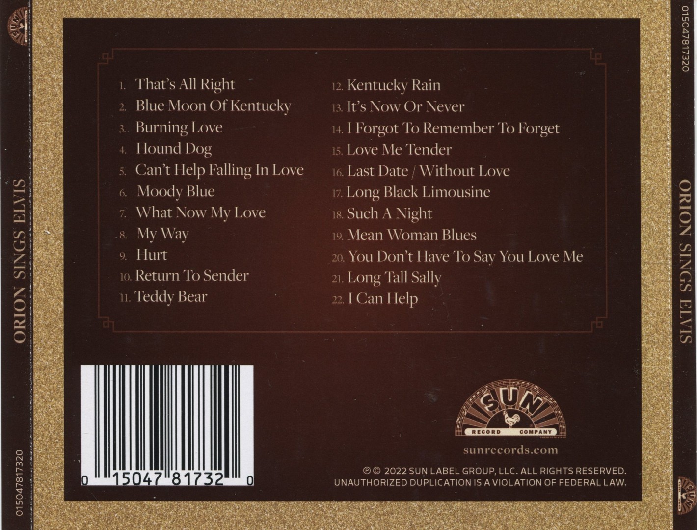 NOTES: This second CD release is different from the original LP album and first CD release. The original releases were in mono. In this re-issue the two Charlie Rich mono duet recordings (Sail Away and Am I To Be The One) have been replaced by three stereo Orion duets (Money, Good Rockin' Tonight and Be Bop A Lula) from the TRIO+ album, making it both an entirely stereo release and also more appealing to Orion fans.