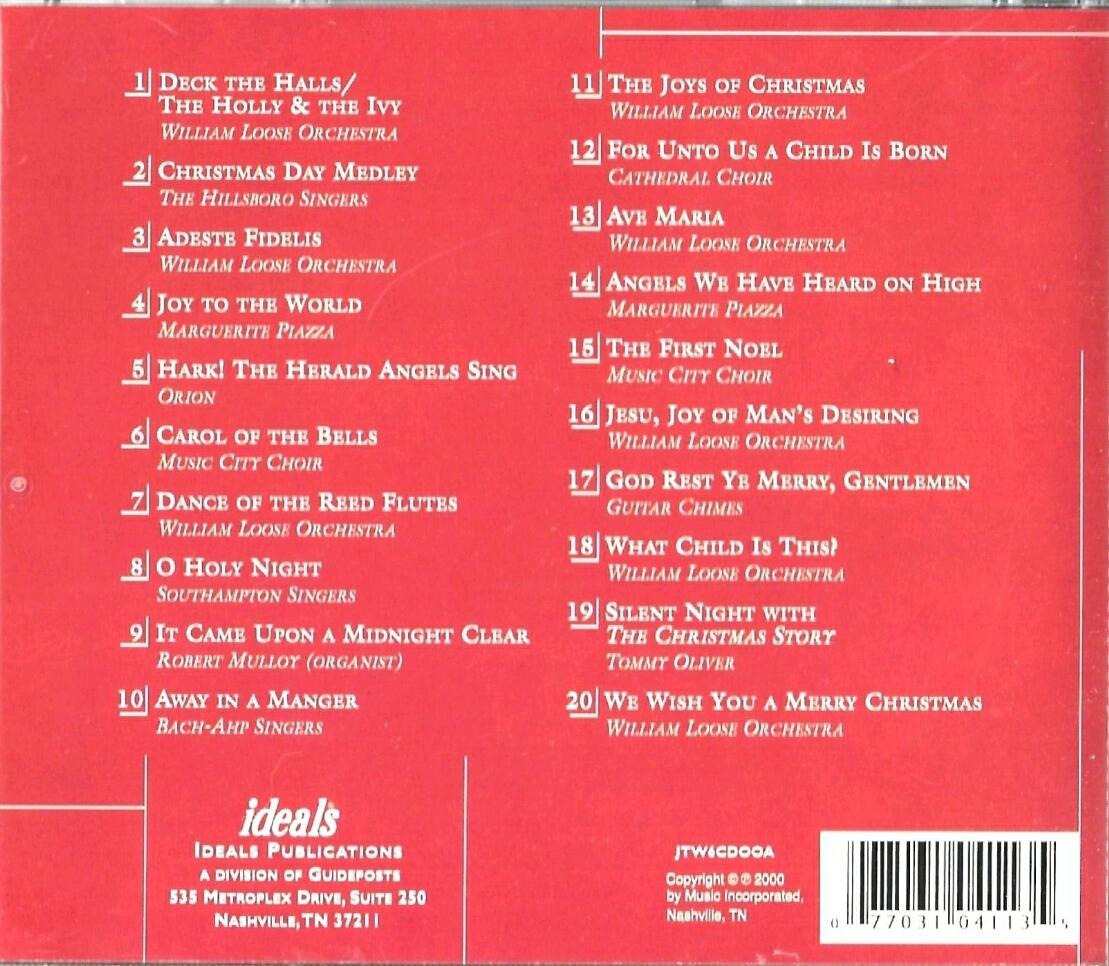 Deck The Halls/The Holly & The Ivy (William Loose Orchestra); Christmas Day Medley (The Hillsboro Singers); Adeste Fideles (William Loose Orchestra); Joy To The World (Marguerite Piazza); Hark! The Herald Angels Sing (Orion); Carol Of The Bells (Music City Choir); Dance Of The Reed Flutes (William Loose Orchestra); O Holy Night (Southampton Singers); It Came Upon A Midnight Clear (Robert Mulloy); Away In A manger (Bach-Amp Singers); The Joys Of Christmas (William Loose Orchestra); For Unto Us A Child Is Born (Cathedral Choir); Ave Maria (William Loose Orchestra); Angels We Have Heard On High (Marguerite Piazza); The First Noel (Music City Choir); Jesu, Joy Of Man's Desiring (William Loose Orchestra); God Rest Ye Merry, Gentlemen (Guitar Chimes); What Child Is This? (William Loose Orchestra); Silent Night With The Christmas Story (Tommy Oliver); We Wish You A Merry Christmas (William Loose Orchestra).